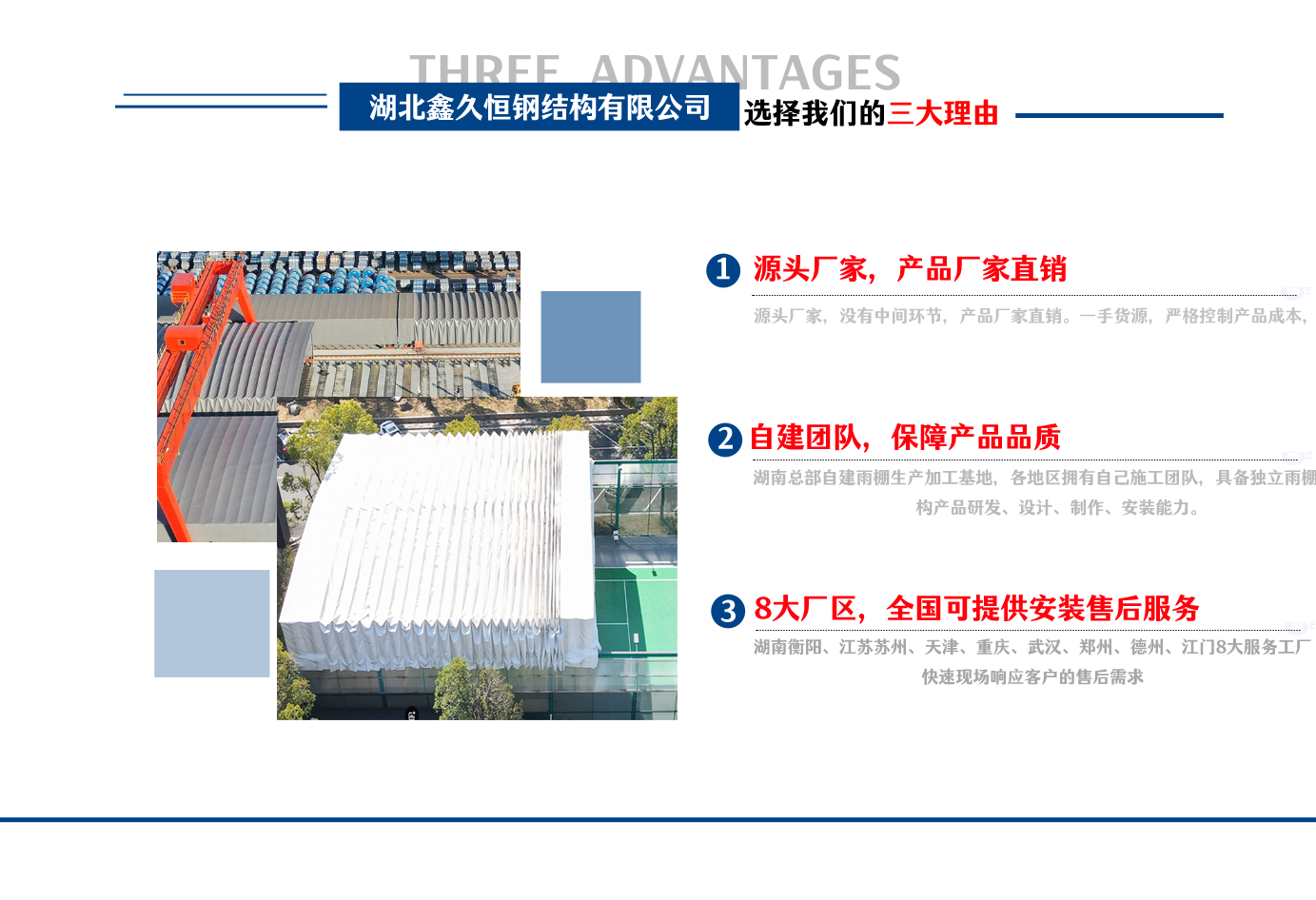 湖北鑫久恒鋼結(jié)構(gòu)有限公司是一家電動(dòng)雨棚、膜結(jié)構(gòu)車棚研發(fā),生產(chǎn)銷售,施工安裝于一體的專業(yè)鋼結(jié)構(gòu)科技公司,主要產(chǎn)品有伸縮雨棚,電動(dòng)雨棚,膜結(jié)構(gòu)車棚等?! 『系貐^(qū)職員目前有80多人,占地面積20000平方米,廠房面積15600平方米,配備先進(jìn)的生產(chǎn)流水線,使每件品質(zhì)產(chǎn)品的堅(jiān)實(shí)基礎(chǔ)。 公司在蘇州、天津、重慶、武漢、德州、烏魯木齊、江門均設(shè)有服務(wù)工廠,總?cè)藛T共300多人,擁有專業(yè)的技術(shù)團(tuán)隊(duì),配備先進(jìn)的設(shè)備和流水線生產(chǎn),產(chǎn)能高,貨源充足,發(fā)貨速度快,服務(wù)區(qū)域廣?! ∫苿?dòng)伸縮棚適用于通道臨時(shí)倉(cāng)儲(chǔ)、戶外運(yùn)動(dòng)遮陽(yáng)、污水池遮蓋、能源交通、熱力化工、礦山、船舶制造及市政建設(shè)、物流、碼頭等領(lǐng)域的構(gòu)件制作加工,成品半成品存放、倉(cāng)庫(kù)、野外儀器設(shè)備操作用房等。尤其是對(duì)工廠發(fā)貨、倉(cāng)儲(chǔ)臨時(shí)遮雨防嗮,梅雨期較長(zhǎng)、建設(shè)周期較短的工程施工等特別適用。還可根據(jù)用戶需求量身定制、適合企業(yè)所需不同款式的產(chǎn)品?! ∥夜緢?jiān)持“誠(chéng)信社會(huì)為本,客戶滿意為榮”的經(jīng)營(yíng)理念,做到質(zhì)量把控,嚴(yán)格管理,精益求精,恪守承諾。使鑫久恒逐步走向成熟,其系統(tǒng)化、專業(yè)化日趨完善。以專業(yè)的技術(shù)、科學(xué)的管理,更高的產(chǎn)品質(zhì)量,優(yōu)良的企業(yè)信譽(yù),真誠(chéng)的客戶服務(wù),靈活多樣的經(jīng)營(yíng)方式和務(wù)實(shí)創(chuàng)新的企業(yè)精神愿與社會(huì)各界攜手合作,為推動(dòng)智能鋼結(jié)構(gòu)建筑事業(yè)的發(fā)展而不斷努力。...